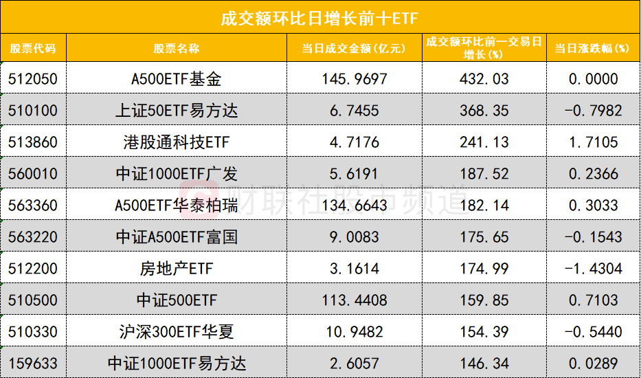 从成交额环比增长前十的ETF来看,A500ETF基金(512050)成交额环比增长432%位居首位;上证50ETF易方达(510100)成交额环比增长368%位居次席。