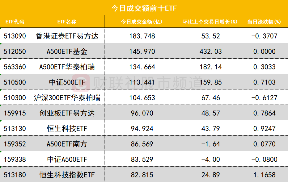 从成交额前十的ETF来看,香港证券ETF易方达(513090)成交额位居首位,A500ETF基金(512050)成交额位居次席。