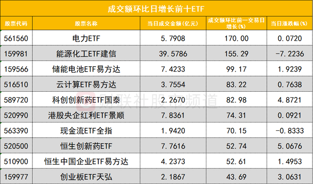 从成交额环比增长前十的ETF来看,电力ETF(561560)成交额环比增长170%位居首位;能源化工ETF建信(159981)成交额环比增长155%位居次席。