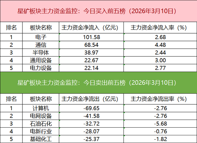 从主力板块资金监控数据来看,电子板块主力资金净流入居首。
