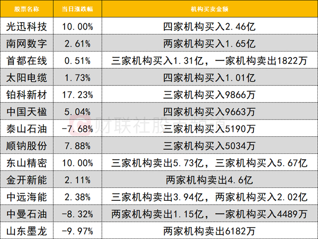 今日龙虎榜机构活跃度较高,算力硬件概念集体爆发,东山精密涨停,遭三家机构卖出5.73亿,同时深股通卖出1.85亿,而三家机构买入5.67亿。CPO概念人气股光迅科技强势涨停,获四家机构买入2.46亿,同时深股通买入2.22亿。OpenClaw概念股首都在线获三家机构买入1.31亿,一家机构卖出1822万。