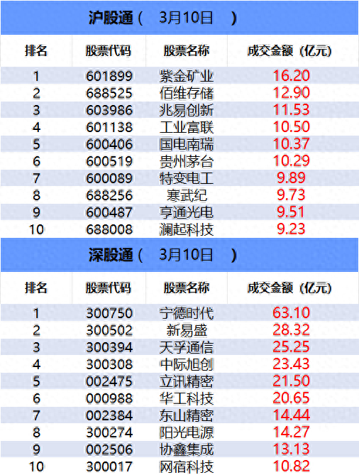 从沪股通前十大成交个股来看,紫金矿业位居首位;佰维存储和兆易创新分居二、三位。