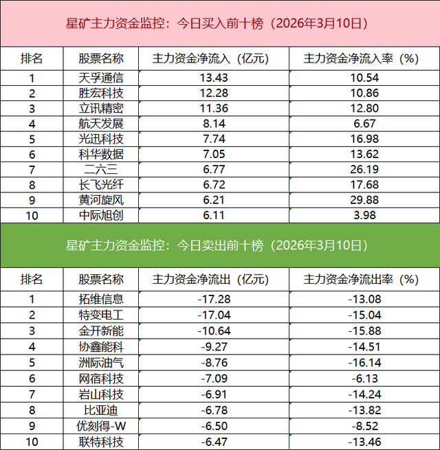 主力资金流出前十的个股所属板块较为分散,拓维信息净流出居首。
