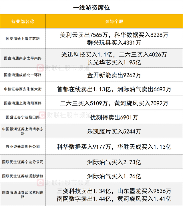 一线游资活跃度较高,光迅科技获一家一线游资(国泰海通证券南京太平南路)买入1.1亿。