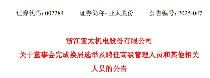 7月23日,亚太股份发布公告,当日召开的董事会审议通过了董事会换届选举相关议案,黄超杰被新提名为非独立董事候选人。8月8日,亚太股份发布换届公告,黄超杰新任公司总经理。
