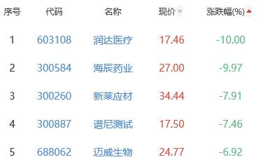 润达医疗、海辰药业、新莱应材、谱尼测试、迈威生物位列涨幅榜后五位,涨幅分别为-10.00%、-9.97%、-7.91%、-7.46%、-6.92%。