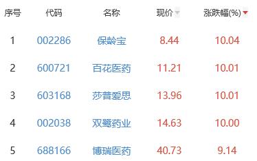 其中,保龄宝、百花医药、莎普爱思、双鹭药业、博瑞医药位列板块涨幅前五位,涨幅分别为10.04%、10.01%、10.01%、10.00%、9.14%。