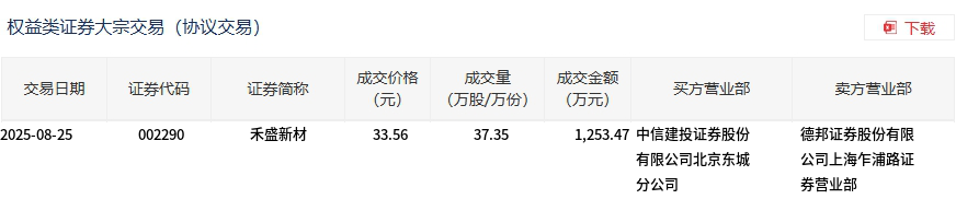 禾盛新材今日大宗交易折价成交37.35万股,成交额1253.47万元