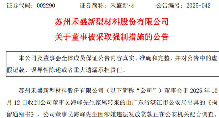 公告显示,禾盛新材公司董事会于2025年10月12日收到公司董事吴海峰家属转来的由广东省湛江市公安局出具的《拘留通知书》,吴海峰因涉嫌违法发放贷款正在公安机关配合调查。该事项系针对吴海峰个人,与公司无关联。