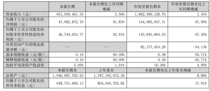 其中第三季度,禾盛新材营业收入为6.51亿元,同比增长3.50%;归母净利润为4708.29万元,同比增长91.83%;扣非归母净利润为4674.47万元,同比增长92.91%;基本每股收益0.19元。