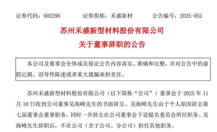 公告显示,禾盛新材公司董事会于11月10日收到董事吴海峰的书面辞呈。吴海峰因个人原因辞去第七届董事会董事及董事会下设提名委员会职务,辞职后不在公司(含子公司、分公司)担任其他职务。