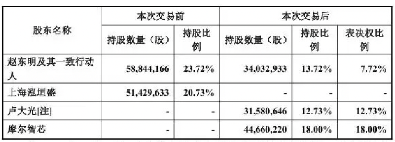 交易完成后赵东明及其一致行动人持股比例将从当前水平降至13.72%,同时需放弃其中6%股份的表决权。