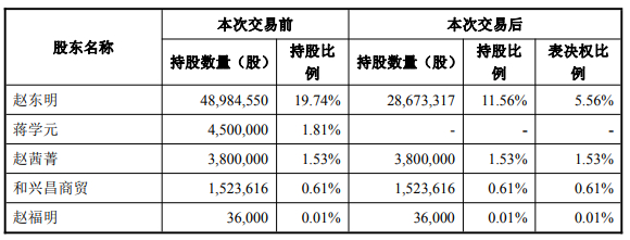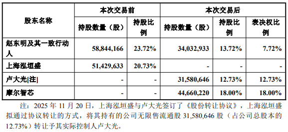 本次权益变动后,赵东明及其一致行动人蒋学元、赵茜菁、苏州和兴昌商贸有限公司及赵福明共同持有公司13.72%的股权,表决权比例合计为7.72%。摩尔智芯持有公司18.00%的股权,摩尔智芯成为公司控股股东,谢海闻成为公司实际控制人。同时,为保证摩尔智芯、谢海闻对上市公司的控制地位,赵东明和卢大光出具了《不谋求控制权承诺函》。