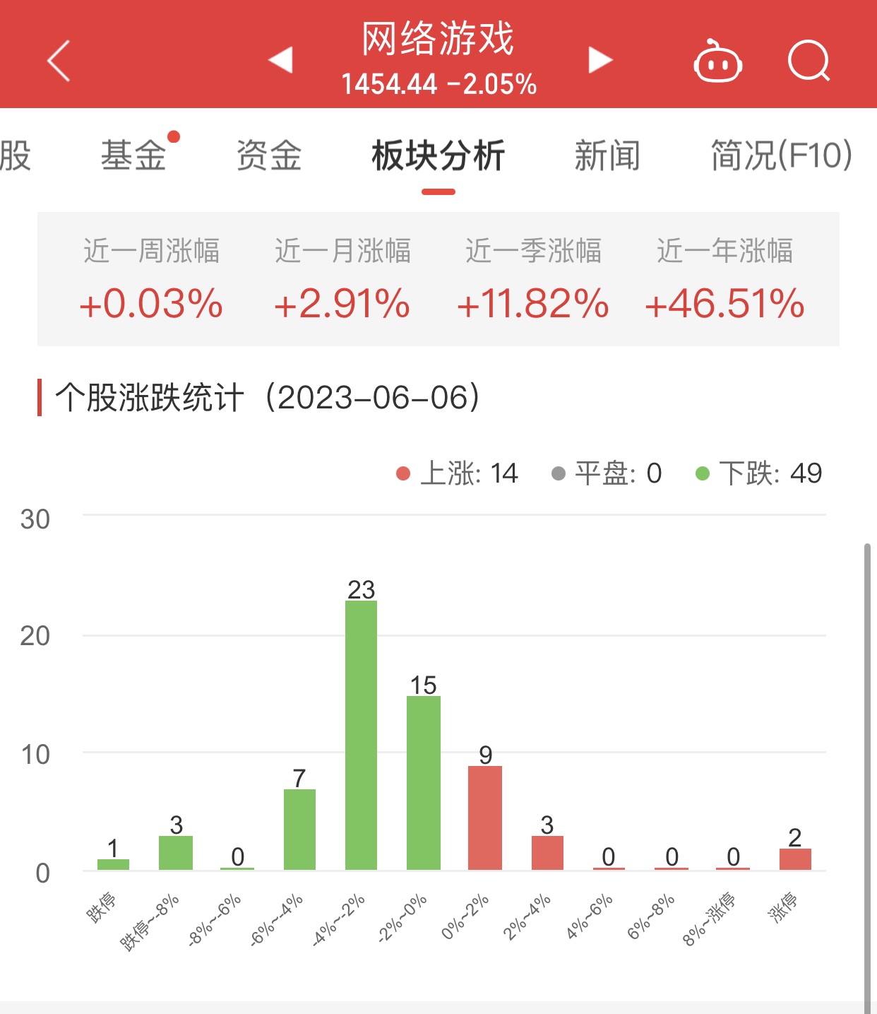 中国经济网北京6月6日讯今日,网络游戏板块整体跌幅2.05%,其中14只股票上涨,0只股票平盘,49只股票下跌。