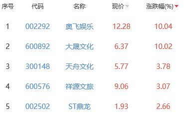 其中,奥飞娱乐、大晟文化、天舟文化、祥源文旅、ST鼎龙位列板块涨幅前五位,涨幅分别为10.04%、10.02%、3.78%、3.07%、2.66%。