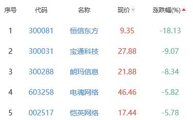 恒信东方、宝通科技、朗玛信息、电魂网络、恺英网络位列涨幅榜后五位,涨幅分别为-18.13%、-9.07%、-8.34%、-5.82%、-5.78%。