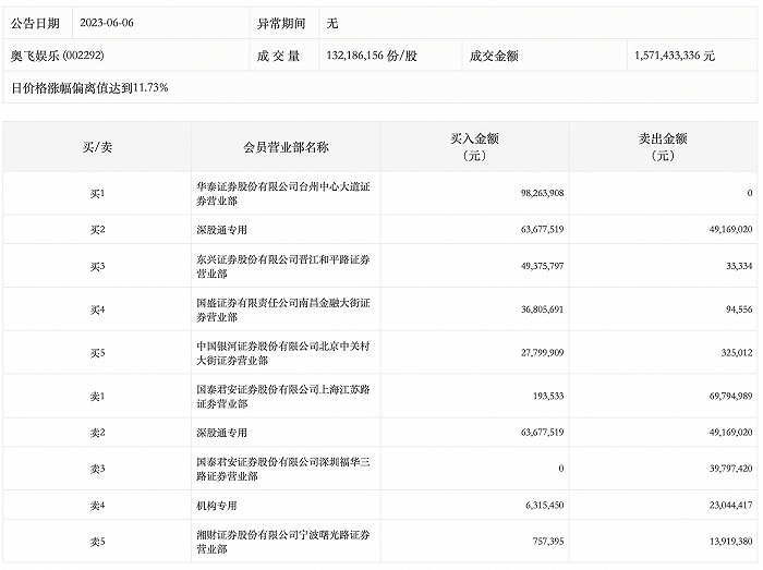 6月6日,奥飞娱乐今日涨停,龙虎榜数据显示,上榜营业部席位全天成交4.79亿元,占当日总成交金额比例为30.51%。其中,买入金额为2.83亿元,卖出金额为1.96亿元,合计净买入8701.11万元。