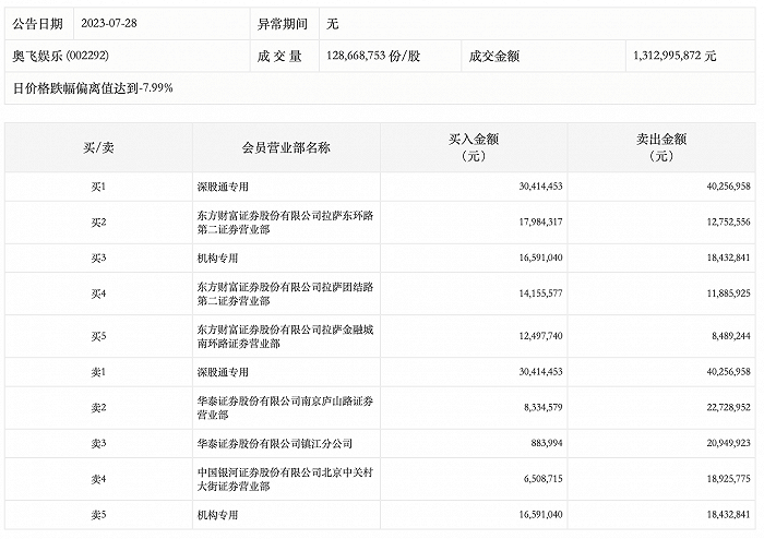 7月28日,奥飞娱乐今日跌6.77%,龙虎榜数据显示,上榜营业部席位全天成交2.62亿元,占当日总成交金额比例为19.94%。其中,买入金额为1.07亿元,卖出金额为1.54亿元,合计净卖出4705.18万元。