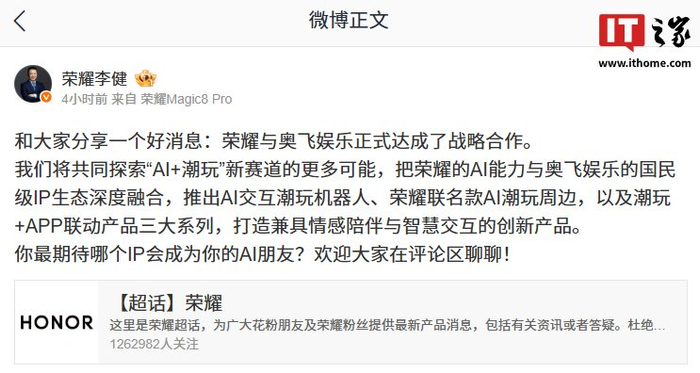 IT之家 11 月 12 日消息,荣耀终端股份有限公司 CEO 李健今日宣布:荣耀与奥飞娱乐正式达成了战略合作。他表示,双方将共同探索“AI+ 潮玩”新赛道的更多可能,推出 AI 交互潮玩机器人、荣耀联名款 AI 潮玩周边,以及潮玩 + App 联动产品三大系列。