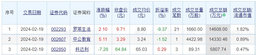 上证报中国证券网讯 据东方财富Choice数据,2月19日A股共111只个股发生大宗交易,总成交11.48亿元,其中罗莱生活、中公教育、科达利成交额居前,成交额依次为1.46亿元、1.43亿元、5807.74万元。