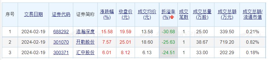 成交价方面,同辉信息、蓝思科技、渤海租赁溢价率居前,溢价率依次为13.64%、9.58%、1.44%;浩瀚深度、开勒股份、汇中股份折价率居前,折价率依次为30.68%、25.63%、24.51%。