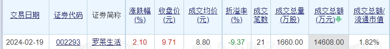 上证报中国证券网讯 据东方财富Choice数据,罗莱生活2月19日大宗交易成交1660万股,成交额1.46亿元,占当日总成交额的72.37%,成交价8.8元,较市场收盘价9.71元折价9.37%。