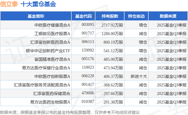 根据2025基金Q3季报公募基金重仓股数据,重仓该股的公募基金共80家,其中持有数量最多的公募基金为中欧基金的中欧医疗健康混合A。中欧医疗健康混合A目前规模为169.77亿元,最新净值1.902(11月12日),较上一交易日上涨0.92%,近一年上涨8.97%。该公募基金现任基金经理为葛兰 赵磊。葛兰在任的基金产品包括:中欧明睿新起点混合,管理时间为2018年7月12日至今,期间收益率为81.85%;中欧医疗创新股票A,管理时间为2019年2月28日至今,期间收益率为56.52%。