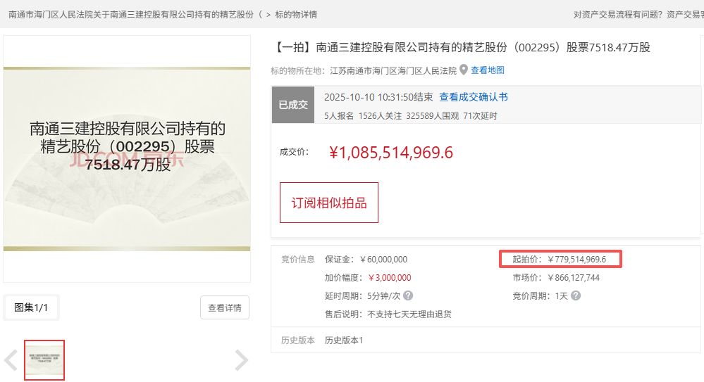 京东网司法拍卖平台显示,本次起拍价为拍卖日前20个交易日收盘价平均价格的90%,最终落锤的10.86亿元竞拍价较约7.8亿元的起拍价增值约40%,折合每股约14.44元,较精艺股份10月10日收盘价(14.71元)折价约1.84%。