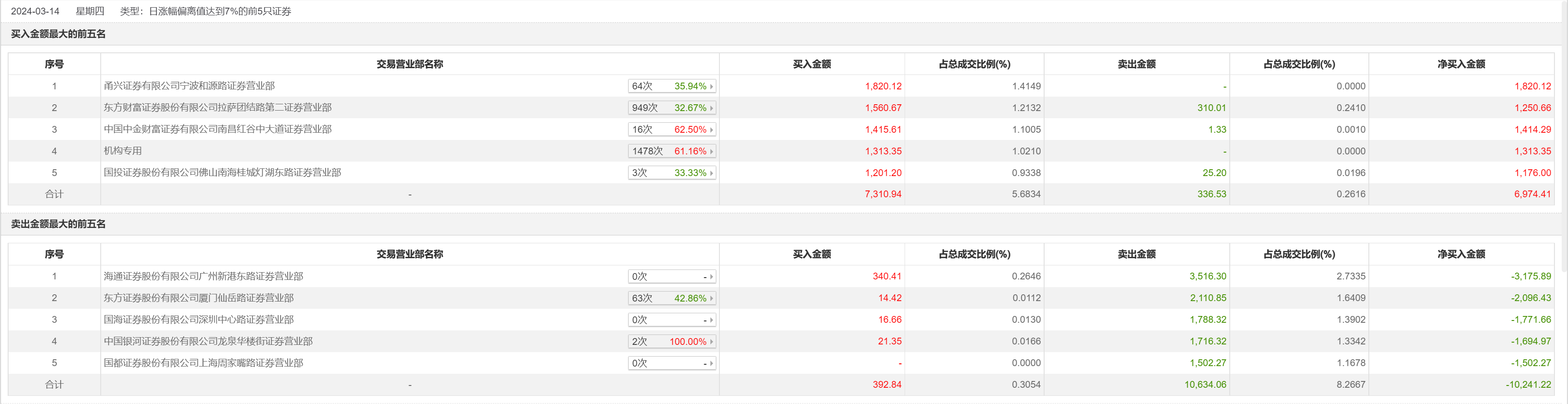 具体来看,机构合计净买入1313.35万元。此外,甬兴证券有限公司宁波和源路证券营业部、东方财富证券拉萨团结路第二证券营业部分别买入1820.12万元、1560.67万元;海通证券广州新港东路证券营业部、东方证券厦门仙岳路证券营业部分别卖出3516.30万元、2110.85万元。