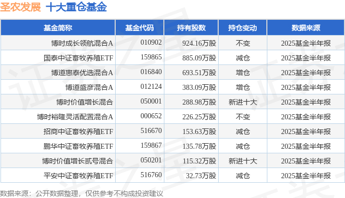 持有圣农发展最多的基金为博时成长领航混合A,目前规模为30.81亿元,最新净值0.8012(10月22日),较上一交易日下跌0.73%,近一年上涨12.73%。该基金现任基金经理为陈鹏扬 郭康斌。