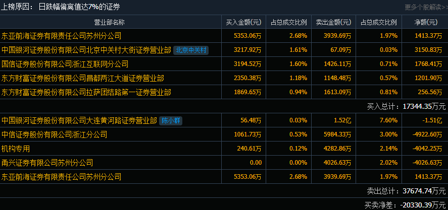 太阳电缆(002300)今日跌9.97%,成交额19.98亿元,换手率23.43%,盘后龙虎榜数据显示,有1家机构专用席位净卖出4042.25万元。陈小群席位净卖出1.51亿元。