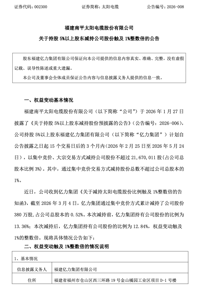 太阳电缆:股东福建亿力集团3月5日减持380万股公司股份