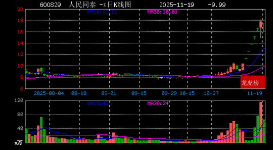 截止收盘,人民同泰报收15.95元/股,涨幅-9.99%,成交量65万手,成交额10.60亿元,换手率11.22%。今日未涨停。