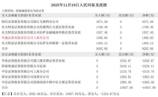 【汇总】合计买入:9282.98万元,合计卖出:10507.85万元,净买入:-1224.87万元。