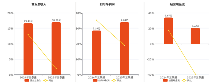 公司营业总收入为30.00亿元。归母净利润为2.60亿元。经营活动现金净流入为2.22亿元,较去年同报告期经营活动现金净流入减少1.44亿元,同比较去年同期下降39.37%。