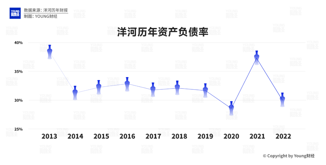 2013年-2022年间洋河资产负债率数据来源:洋河历年财报制图:YOUNG财经