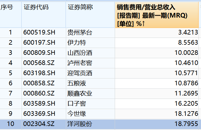 茅台就不用说了,销售费用率只有3.4%。即便同为第二梯队的五粮液、山西汾酒和泸州老窖,销售费用率也在10%左右的区间。