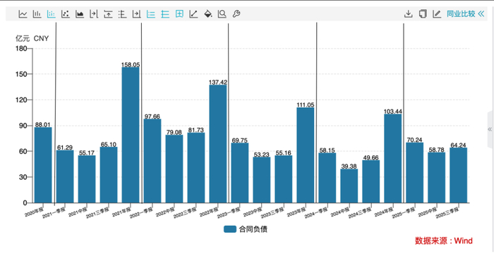 2025年第三季度,洋河股份的合同负债为64亿,同比增长幅度达29.4%;环比也增长9.4%。