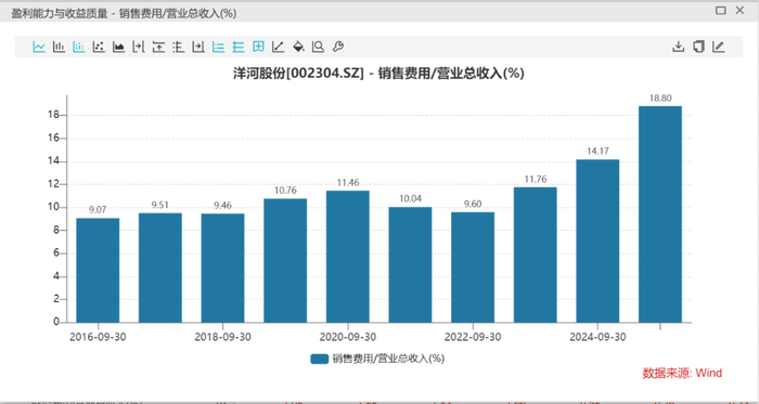 而从2025年前三季度的数据来看,在同一个口径之下(当年度前三个季度),洋河的销售费用率不仅创下近10年新高,同样也是TOP5中最高的。