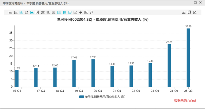这意味着,洋河股份三季度单季度销售费用率高达12.51亿/ 32.94亿= 37.99%!