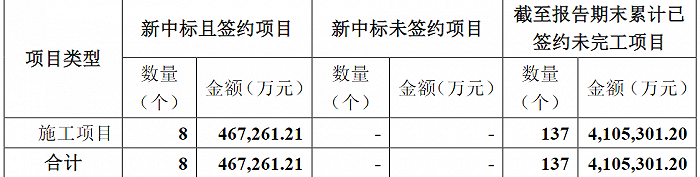 新中标且签约项目8个,合计金额46.73亿元。截至报告期末累计已签约未完工项目137个,合计金额410.53亿元。