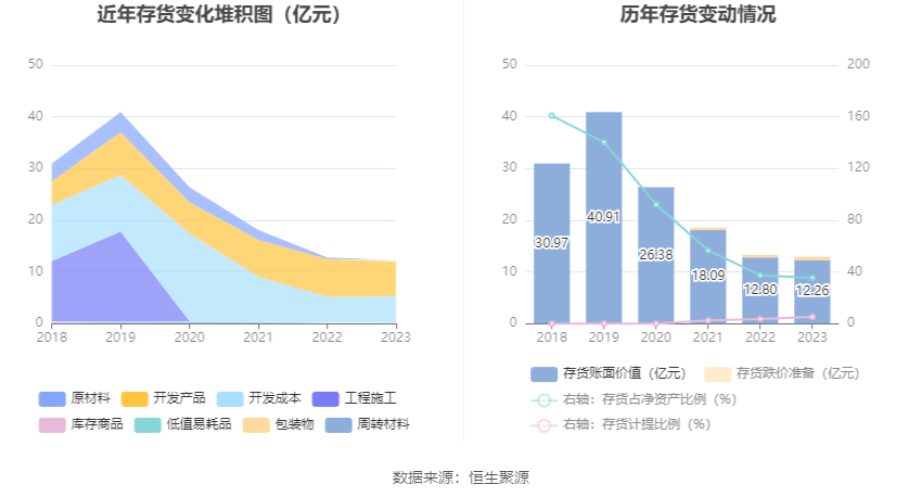 从存货变动来看,截至2023年年末,公司存货账面价值为12.26亿元,占净资产的35.56%,较上年末减少5390.69万元。其中,存货跌价准备为6699.85万元,计提比例为5.18%。
