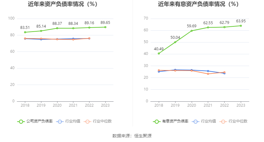 在偿债能力方面,公司2023年年末资产负债率为89.65%,相比上年末上升0.49个百分点;有息资产负债率为63.95%,相比上年末上升1.16个百分点。