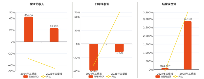 公司营业总收入为13.58亿元。归母净利润为-1.40亿元,较去年同报告期归母净利润增加3.14亿元。经营活动现金净流入为10.41亿元,较去年同报告期经营活动现金净流入增加10.11亿元,同比较去年同期上涨3383.91%。