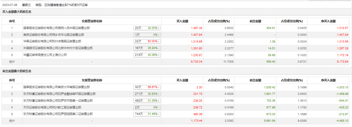 7月26日,东方园林今日涨停,龙虎榜数据显示,上榜营业部席位全天成交1.41亿元,占当日总成交金额比例为24.55%。其中,买入金额为7906.48万元,卖出金额为6220.94万元,合计净买入1685.54万元。