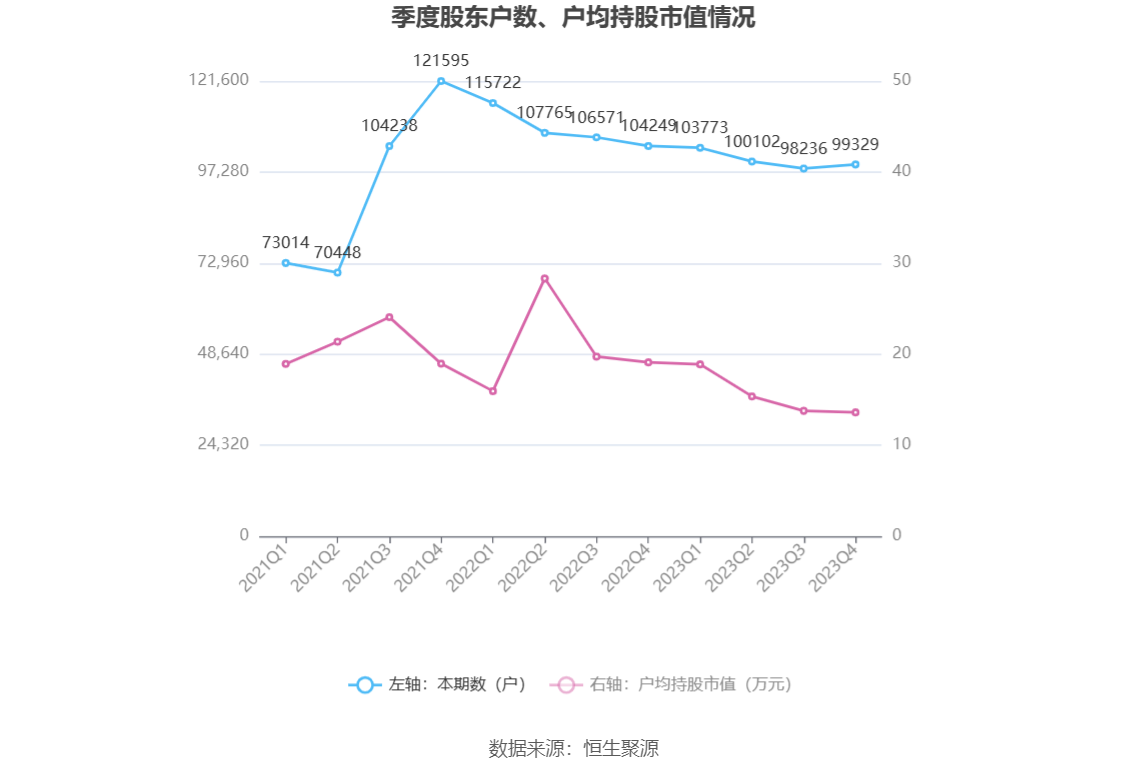筹码集中度方面,截至2023年年末,公司股东总户数为9.93万户,较三季度末增长了1093户,增幅1.11%;户均持股市值由三季度末的13.79万元下降至13.62万元,降幅为1.23%。