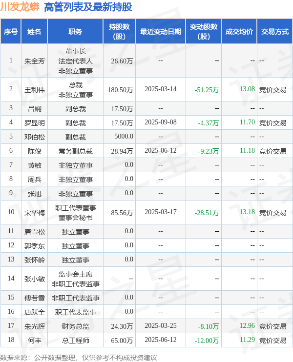 川发龙蟒的高管列表及最新持股情况如下: