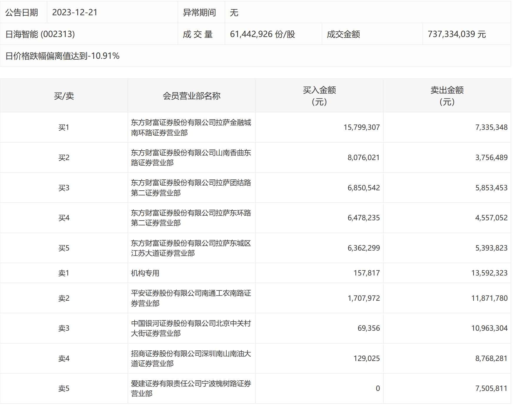 12月21日,日海智能今日跌停,全天换手率达16.42%,振幅达7.49%。龙虎榜数据显示,营业部席位合计净卖出3396.71万元。其中,机构买入15.78万元,卖出1359.23万元,合计净卖出1343.45万元。此外,平安证券南通工农南路证券营业部、中国银河证券北京中关村大街证券营业部分别卖出1187.18万元、1096.33万元;东方财富证券拉萨金融城南环路证券营业部、东方财富证券山南香曲东路证券营业部分别买入1579.93万元、807.60万元。
