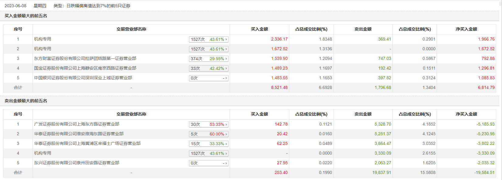 具体来看,机构买入4008.69万元,卖出3699.5万元,合计净买入309.19万元。此外,广发证券上海东方路证券营业部、华泰证券淮安淮海东路证券营业部分别卖出5328.70万元、5251.37万元;东方财富证券拉萨团结路第一证券营业部、国金证券上海静安区南京西路证券营业部分别买入1539.90万元、1489.23万元。