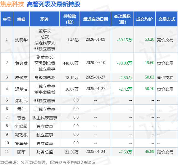 焦点科技近半年内的董监高及核心技术人员增减持详情如下: